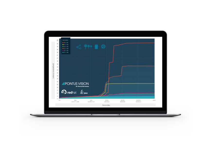 The graph below shows the latency of the system (the lower the line, the better the performance). It shows the impact of different operating systems, Java virtual machines, and the impact of Pontus Vision Thread Manager™ on the system.